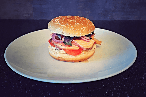 A salmon and omelet burger is an unusual and refined combination of sea and traditional flavors. The tender and juicy salmon acquires a sophisticated aroma after light frying. It is complemented by an airy omelet made with garlic and milk, creating a creamy texture. The lightly toasted bun becomes a crispy base for this gastronomic masterpiece. Sweet red onion and ripe tomatoes add freshness, while the white balsamic sauce gives a slight tanginess. The composition is completed with cream cheese and aromatic red basil leaves, creating a harmonious balance of flavors. This burger is the perfect choice for those who appreciate subtle flavor combinations.
