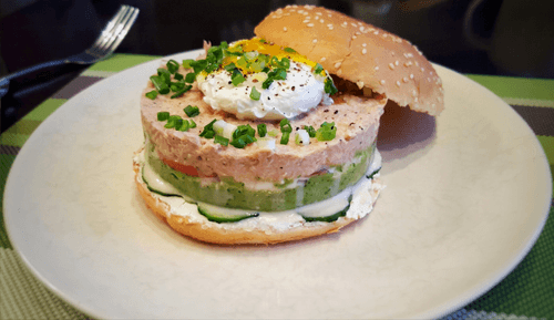 Assembly: spread cream cheese on the bottom part of the bun. Then place cucumber slices. Next, add guacamole (I used a round metal mold for serving garnishes/salads), then add tomatoes, sprinkle with red onion, and top with tuna.