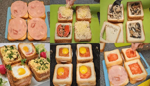 Place the tray with 8 sandwiches in the oven and bake at 180°C until the eggs are set and the cheese melts.