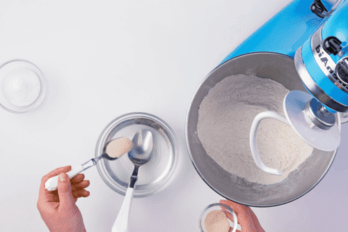 In a bowl, mix 1 tablespoon of honey, yeast, and 1.5 teaspoons of salt with 1 cup of warm water. In the mixer bowl, add flour and pour in the yeast mixture. Knead the dough with the hook on the lowest speed for 3 minutes. The dough should be dense, elastic, and moist. If the dough is too dry, add a little more water. Let the dough rest for 5 minutes.