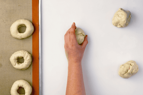 When the dough has risen, prepare a baking tray by lining it with parchment paper or a silicone mat. Lightly grease the surface with vegetable oil. Divide the dough into equal pieces of 113 grams. Form balls. Do not sprinkle flour on the work surface, just wipe it with a damp cloth — this will provide the necessary friction. Make a hole in the middle of the ball with your thumbs. Carefully rotate the dough around your thumbs to stretch it to the desired diameter. Transfer the bagels to the prepared tray, lightly spraying oil on top. Cover with plastic wrap and leave in the refrigerator overnight.