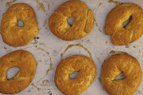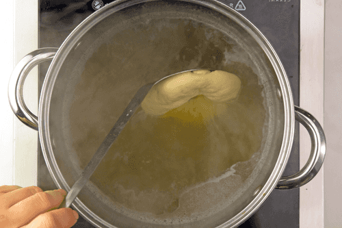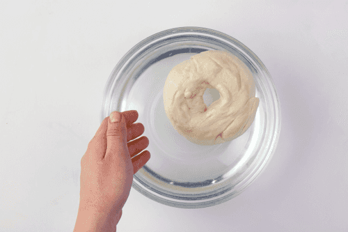 Take the bagels out of the fridge and let them sit at room temperature for 1-1.5 hours. Pour cold water into a bowl. Dip one bagel into the bowl: if it floats, you can start cooking; if not, dry it and leave it at room temperature for another 15-20 minutes. Then test again.
