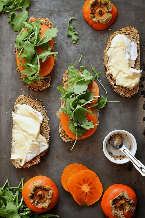A sandwich with persimmon, prosciutto, and Brie cheese is a harmonious blend of sweet, salty, and creamy flavors. Thin slices of prosciutto add richness and piquancy, the delicate Brie cheese adds creamy softness, while juicy persimmon refreshes with its light sweetness. Grainy mustard adds a spicy accent, and arugula provides a mild pepperiness. This sandwich has become a modern gastronomic trend inspired by European cuisine that values flavor balance and simplicity in preparation.