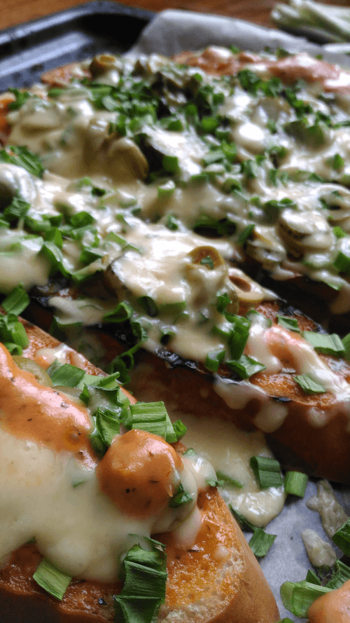 It's time to assemble the bruschettas! Spread sauce on the toasted side of each slice of bread. Place them on a baking tray (use parchment paper). Then add cucumbers, olives, and onions!