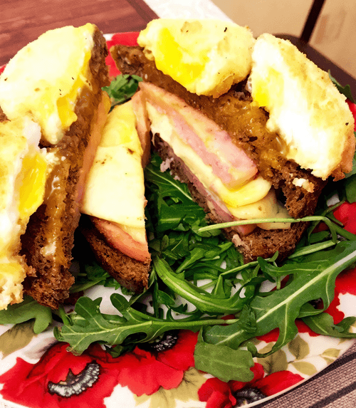 We assemble our sandwiches. We take the cheesy toasts out of the oven, place ham inside, and top with breaded poached eggs. We garnish with salad leaves.