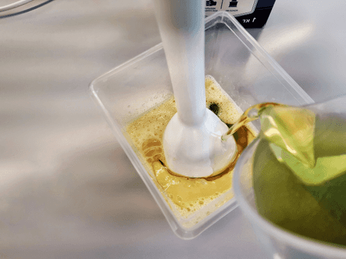 Blend up and down until the mixture thickens somewhat, while continuing to add oil.