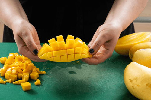 Peel the mango, remove the pit. Chop the flesh into 1.5 cm pieces.