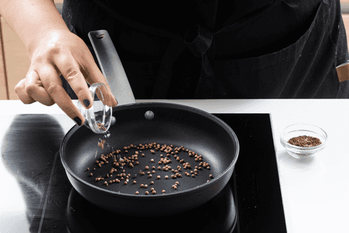 Toast cumin, coriander, and cardamom seeds in a dry pan.