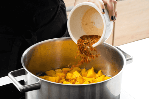 Add the spice mixture to the vinegar. Also, add mango and 2 teaspoons of salt.