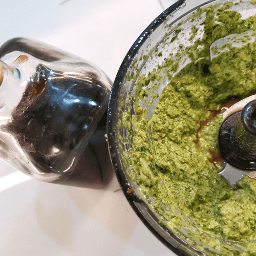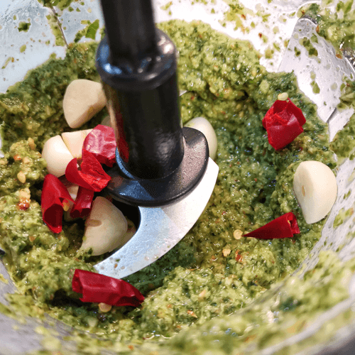 Chop the greens in a blender and add garlic and pepper.