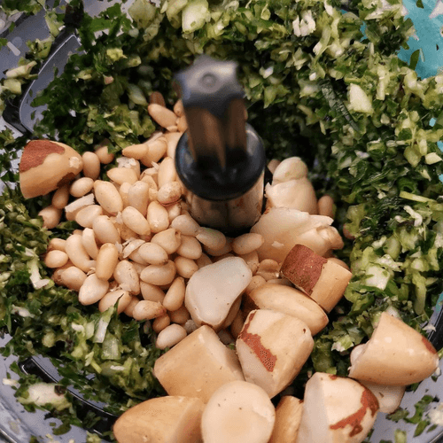 Chop the garlic and Brazil nut, send the pine nuts whole.