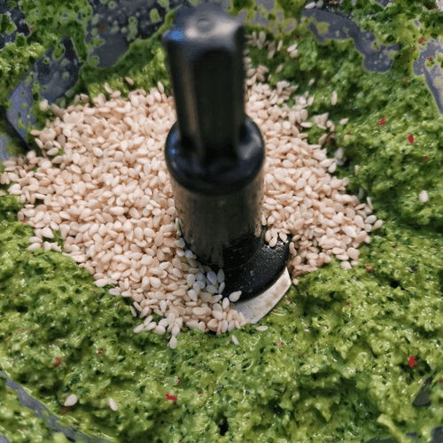 Add sesame and grind to a uniform mass. Optionally, you can add chili pepper.