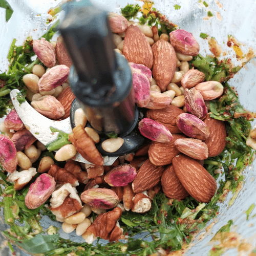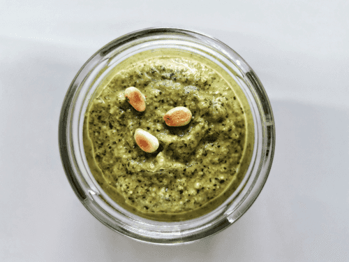 Pesto made from fresh herbs with aromatic spices embodies the Italian passion for freshness and rich flavors. This sauce, inspired by traditional Genoese pesto, features the distinct aroma of cilantro, dill, and tarragon complemented by the spiciness of garlic and the fragrant notes of saffron, sumac, and chili pepper. A rich nutty accent is created by pine nuts, pecans, almonds, and pistachios, while the tenderness in texture comes from napa cabbage and parmesan. Its flavor is multifaceted—from the freshness of greens to the depth of spicy seasonings and a nutty aftertaste. This pesto pairs perfectly with pasta, risotto, roasted vegetables or as a zesty addition to sandwiches and meat dishes. Its rich aroma and velvety consistency make every dish truly special.