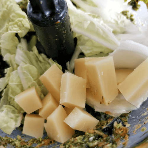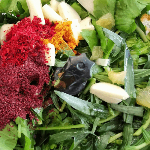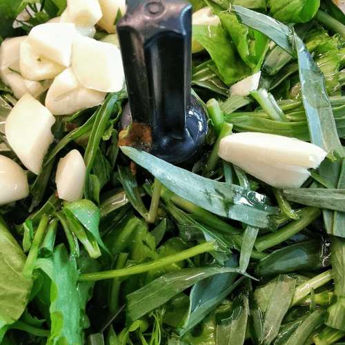 Chop the greens and garlic a little and put them in a blender. Dress with oil.