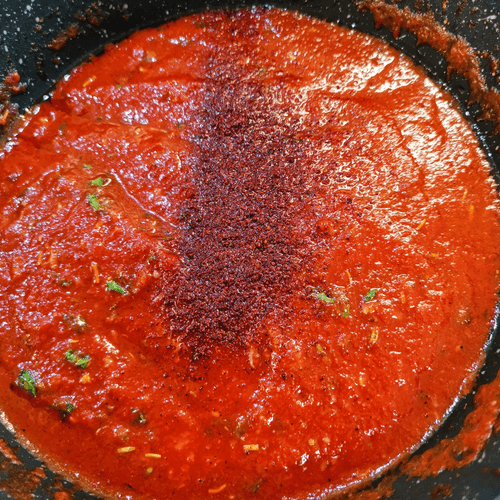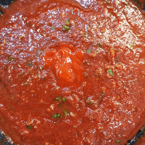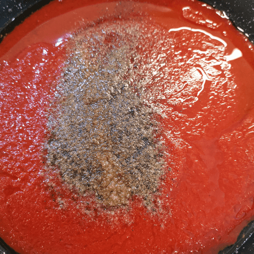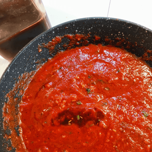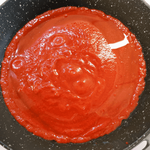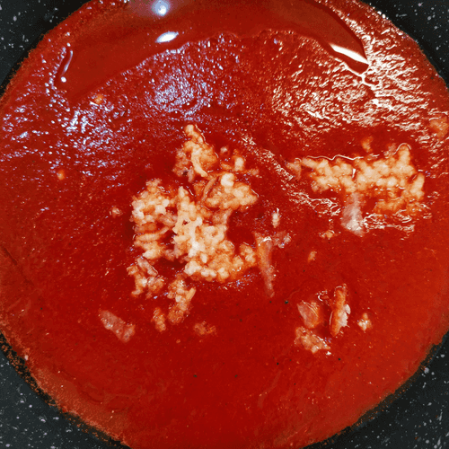 Pour the tomato sauce into the heated olive oil in the pan.