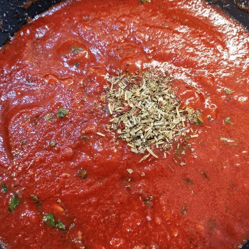 Then add finely chopped basil and dried herbs.