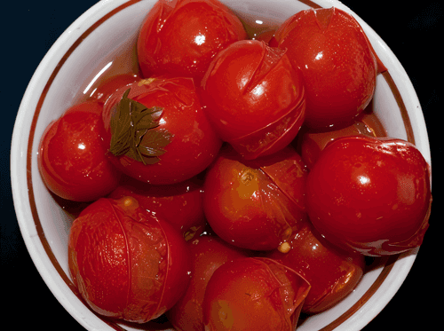 Pickled tomatoes are a traditional dish of Russian cuisine that conveys the spirit of home comfort and winter preparations. Their history goes back to the past when housewives tried to preserve the harvest by turning ordinary vegetables into a spicy treat. Small plum-like tomatoes soaked in the aromas of vinegar, sugar, and spices acquire a rich sweet-sour taste with spicy notes. Cloves, black pepper, and cinnamon add depth to the marinade, creating a rich flavor palette. These tomatoes perfectly complement meat dishes or potatoes or can be enjoyed as a standalone snack. They can be served on festive tables or enjoyed in winter while reminiscing about warm summer days.