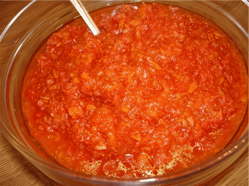 Add vegetable oil, vinegar, and cook for another hour. Add sugar, salt, crushed garlic, and hot pepper, and cook for another 30 minutes on low heat.