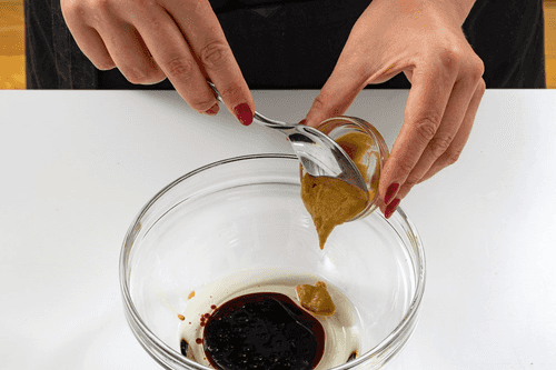 Add honey to the dressing. If the honey is too thick, melt it in the microwave for no more than 20 seconds.