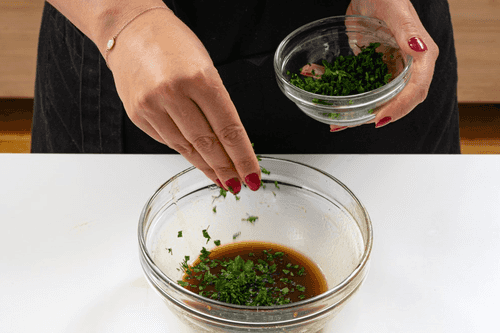 Add dill and parsley to the dressing and mix.