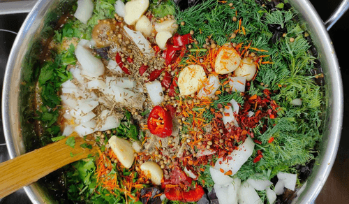 Add finely chopped greens, chili pepper, onion, garlic, and a spice mix to the plum puree. Blend until the desired consistency is reached. Then bring to a boil over low heat while stirring continuously and pour into sterilized jars if preparing the sauce for storage.