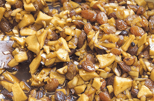 Apple chutney with spices and raisins is a fragrant Indian dish that combines the sweetness of apples and raisins with the spice of ginger, cinnamon, and star anise. Its roots trace back to ancient Indian culinary traditions where chutneys serve as a wonderful complement to main dishes, adding depth of flavor. This chutney has a rich sweet-spicy taste with subtle tangy notes. It pairs well with meat and vegetable dishes and can also be served with cheese or bread. The rich aromas of spices make it special while the sweetness of fruits softens the heat of spices, creating a perfect balance. Its thick, rich texture makes it an ideal sauce that reveals the flavors of food in a new way. Chutney can be stored in a jar and used as a gastronomic accent for various dishes.
