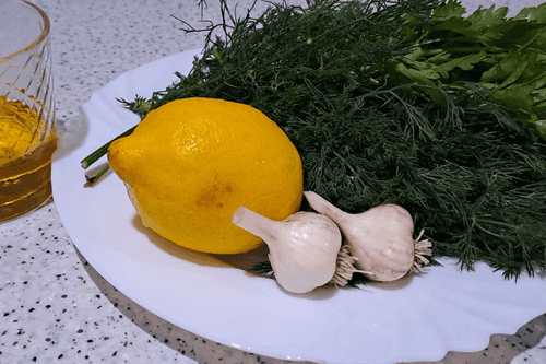Add lemon juice, chopped dill, and parsley to the blender bowl.
