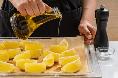 Place lemon slices on a baking sheet, drizzle with olive oil, and season with salt and pepper.