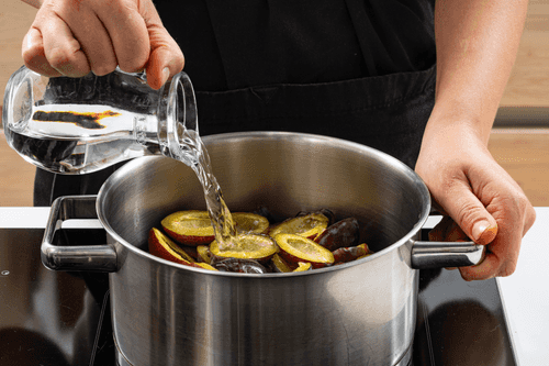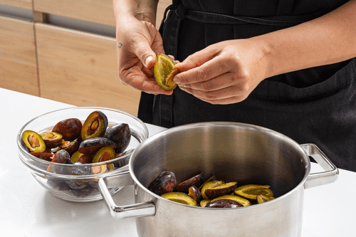 Place the plums in a pot and add 100 ml of water. Bring to a boil and simmer for 15 minutes, stirring occasionally.