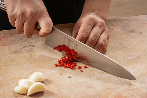 Finely chop the chili pepper and garlic.