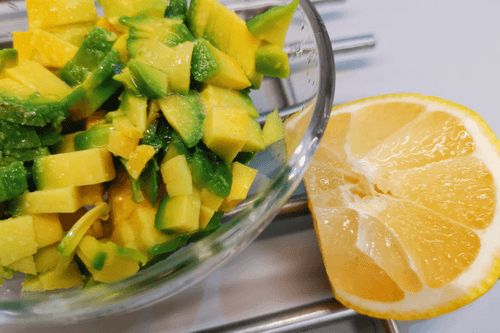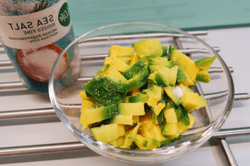 Peel the avocado and chop it into small pieces. Transfer to a bowl and add salt.