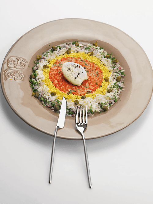 Use a culinary ring to place the tartare on a plate. Arrange grated yolk around its perimeter, then the white, and parsley on the outer perimeter. Finely chop a quarter of a red onion and sprinkle it over the parsley. Finish the presentation with scattered capers and remove the ring. Top with sour cream and lightly pepper.