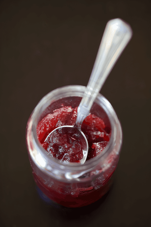 In a saucepan, mix frozen raspberries and cranberries, jam, finely chopped shallots, vinegar, ginger, and allspice.
