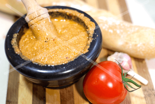 Mix the nut and bread mixture with garlic and tomatoes into a homogeneous paste. While continuing to work with the pestle, pour in the olive oil in a thin stream. The amount of oil should be just enough for the salvitcada to have a consistency similar to semolina or baby food. If necessary, add more salt and vinegar. If you don't want to bother with the mortar, chop all the ingredients in a blender at once.