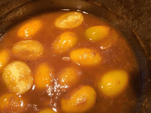 Increase the heat and let the oil and sugar mixture boil until the sugar starts to caramelize.