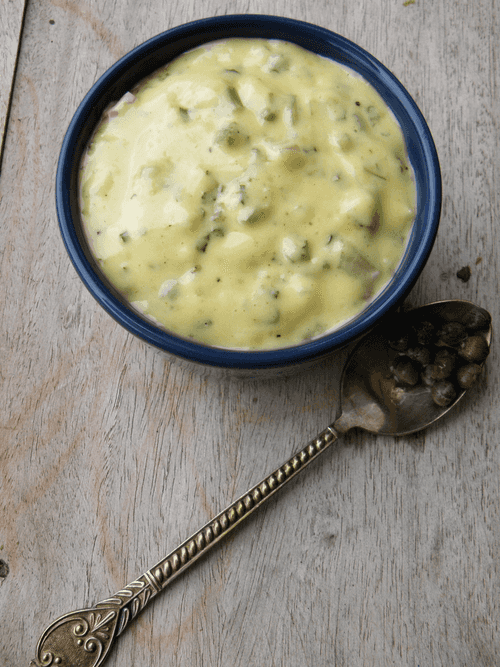 Add onion, capers, gherkins, and herbs to the prepared mayonnaise. Season with salt and pepper to taste. Mix everything well.
