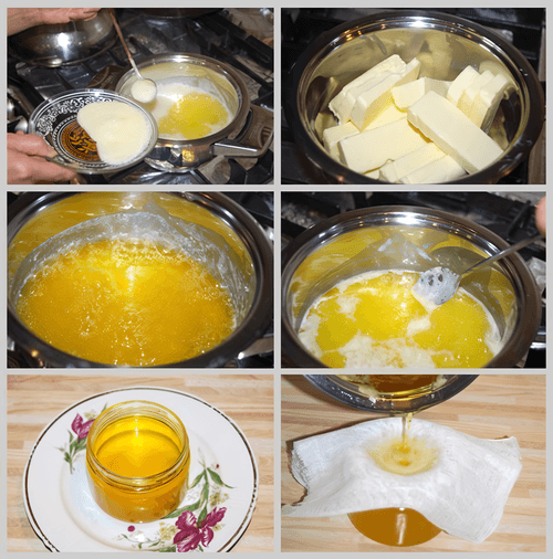 When the white particles at the bottom and on the walls of the pot start to turn golden-brown and the oil is clear enough to see the bottom of the pot, it's a signal to turn off the heat. If the oil is heated on too high a flame or for too long, it will darken and start to emit a pungent smell. The finished ghee has a golden color and is transparent.