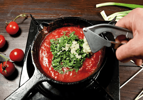 Next, add finely chopped onion, greens, spices, and garlic. Let the sauce simmer for 5 minutes, then allow it to cool down well.