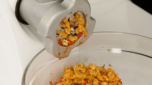 Pass the peppers, peeled garlic, and nuts through the meat grinder.