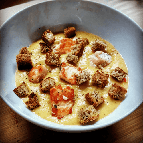 Salmon cream soup is a refined dish of French cuisine that embodies the harmony of flavors and textures. Its delicate, velvety consistency is enriched with sweet notes of carrot and onion, while melted cheese adds softness and a light creamy depth. The secret of this recipe is the aromatic salmon that gives the soup a rich taste of the sea and exquisite nutrition. Crispy croutons add contrast and make each sip especially enjoyable. This soup is perfect for a cozy dinner or as an elegant dish on a festive table. Historically, cream soups originate from France — they are valued for their sophistication and ability to delight even the most discerning gourmets. This version is particularly good for cold evenings when you want to warm up and enjoy something refined yet homely.