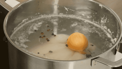 Add a whole onion, peppercorns, bay leaf, and clove. Simmer uncovered on low heat for 1.5 hours. The broth should reduce by about a third.