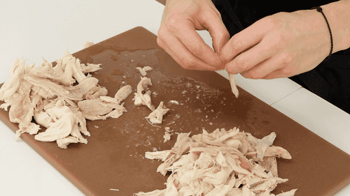 Disassemble the chicken, discard the bones, and cut or tear the large pieces of meat.