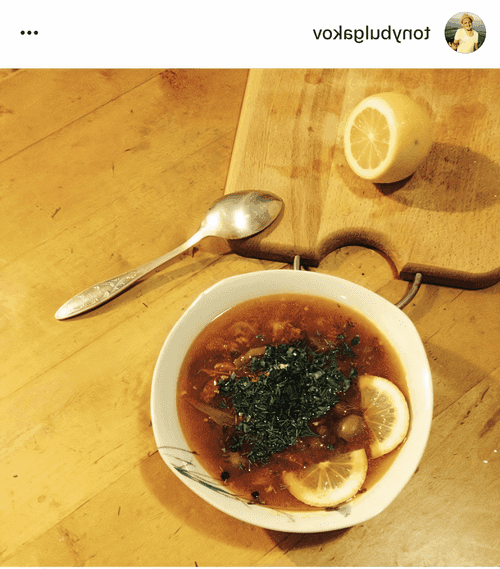 Let it sit for an hour. Then transfer to a plate, add sour cream, lemon, and fresh herbs.