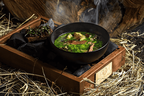 Solokh-Aul soup is a true culinary masterpiece based on the harmony of aromas and flavors. This thick, rich broth is made from roasted veal tails and shanks, enriched with the smoky aroma of sautéed vegetables. Bulgur, soaked in warmth and moisture, adds tenderness and textural fullness to the dish. Beef cheeks, simmered to softness, reveal a rich meaty flavor enhanced by caramelized butter with nutty notes. A light spiciness from bay leaves and peppercorns gives the soup sophistication, while fresh herbs complete this flavor symphony. Solokh-Aul soup is not just food; it's a gastronomic journey where each ingredient plays its role in creating a unique and memorable taste.