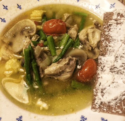At this time, the chicken thighs should be cooked, remove them from the broth and cool them down, then pour the broth into a wok, add lemongrass and small pieces of peeled galangal. Once the broth boils, add mini corn and asparagus. Cook for 2-3 minutes, then turn off and let it steep for a while.