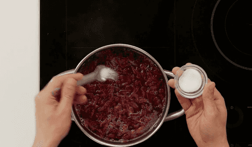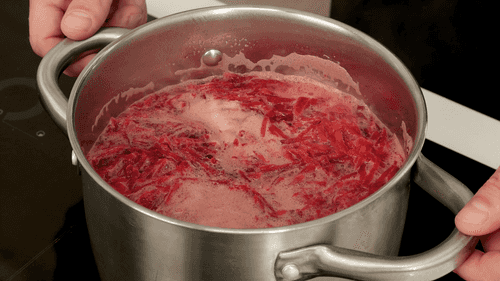 Peel 500 g of beetroot, grate it and transfer to a pot. Pour in hot broth, add citric acid and bring to a boil. Let it steep for 30 minutes, then strain.
