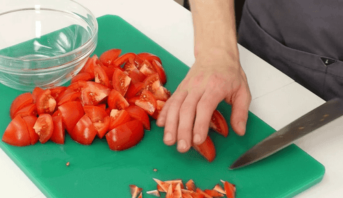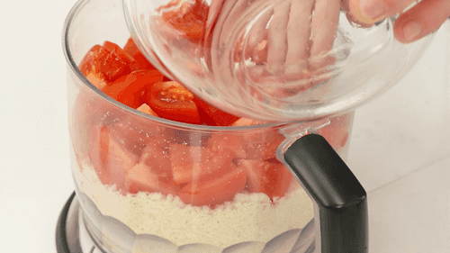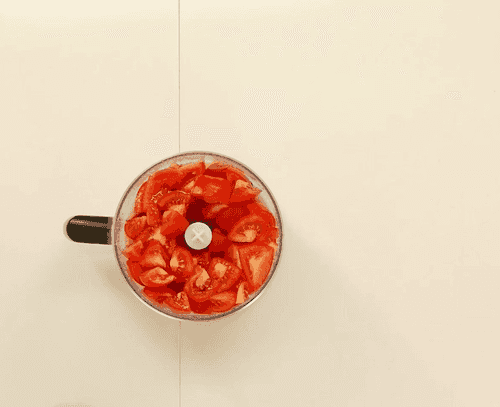 Blend the bread and tomatoes with garlic, olive oil, and vinegar.