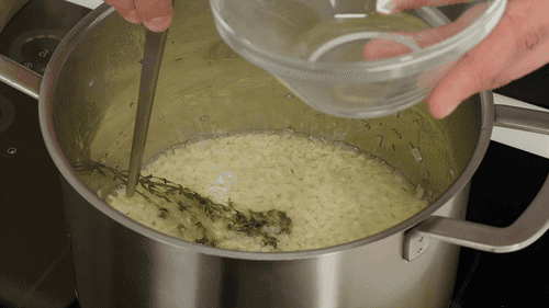 Heat butter and vegetable oil in a pot, add a couple of thyme sprigs, sauté for a minute, then add diced onion and sauté until translucent. Remove the thyme that has imparted its aroma.