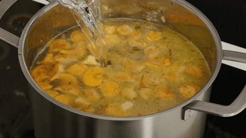 Add diced carrots, mix, add chanterelles torn in half, and sauté for a couple more minutes while stirring.