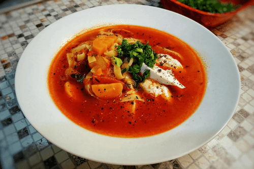 Prepare broth from chicken, two carrots, two onions, celery root, five cloves of garlic, and spices (bay leaf, black and allspice). Pour in white wine 15 minutes before cooking ends.